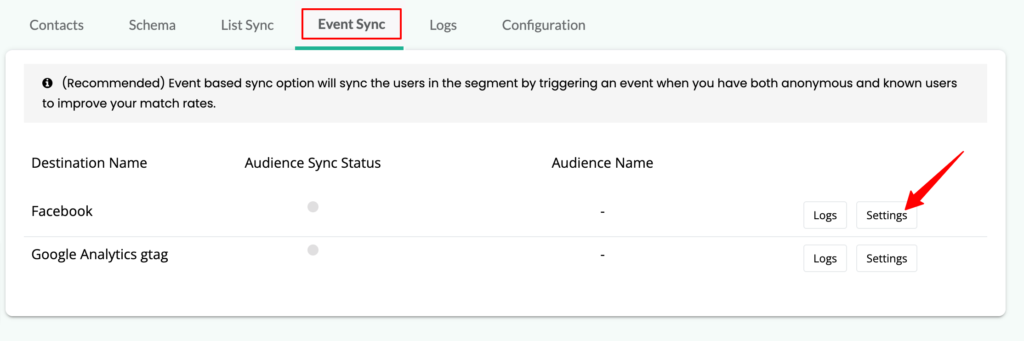 1. Go to โEvent Syncโ tab of the audience you want to sync.